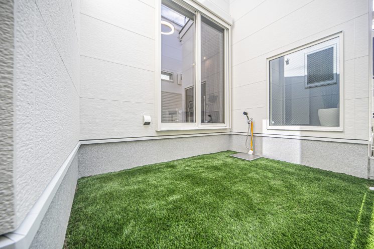天然素材の充填材「寒土-KANDO®-」を使用しており、天然芝に極限まで近い環境を実現しています。人肌や犬ちゃんにも優しい人工芝です。※現地写真(2025年11月撮影)